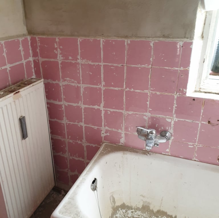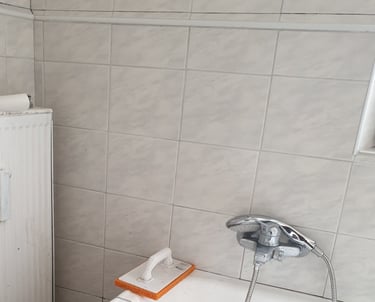 Kunde hatte Klebefliesen auf die unverputze Wand geklebt. Wand wurde zuerst bereinigt, gespachtelt und grundiert. 35m² Wandfliesen mit baulich bedingtem 25mm Vorsatz auf etwa 1,30 Höhe. Die Herausforderung war hier, umlaufend 5mm breite Fliesenabschnitte auf dem Vorsatz hinter der Echschiene zu verlegen.