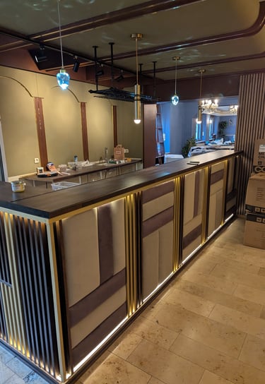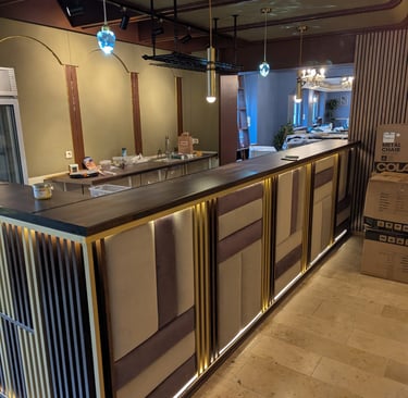 Wandelemente und Farbkomposition nach Kundenwunsch. Installation der Lampen und Akustikpaneele im Vorraum. (s. Abb. links)